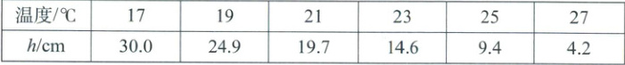 21. 某学习小组的同学自制了一个简易温度计,A为一塑料瓶,B为吸管,通过软木塞与A相连,管下端插入水槽中,使管内外水面有一高度差h,在不同温度下分别测出对应水柱高度h,记录数据如表: