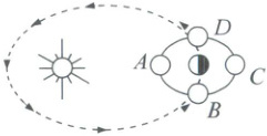 C.月球公转到B点时是下弦月,月面朝西