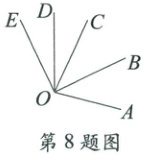 8. 如图所示,$OB$是$\angle AOC$的平分线,$OD$是$\angle COE$的平分线。如果$\angle AOC = 80^{\circ}$,$\angle COE = 50^{\circ}$,那么$\angle BOD =$