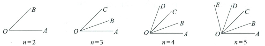 5. (10分)如图所示,从一点$O$出发,引两条射线可以得到1个角,引三条射线可以得到3个角,引四条射线可以得到6个角,引五条射线可以得到10个角。如果从一点出发引$n$($n$为大于等于2的整数)条射线,则会得到多少个角?当$n = 8$时,会得到多少个角?