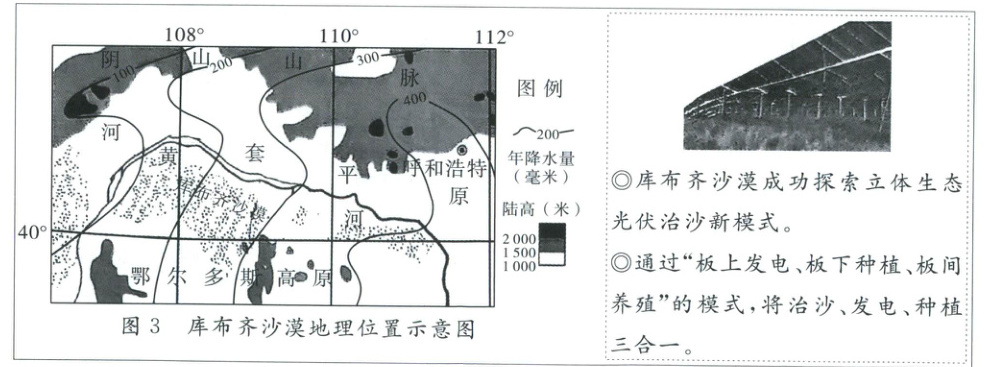 (1) 根据图 3,描述库布齐沙漠的地理位置。(2 分)