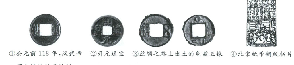 ①公元前118年,汉武帝下令铸造的五铢钱 ②开元通宝 ③丝绸之路上出土的龟兹五铢 ④北宋纸币铜版拓片