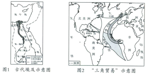 (1)请根据图1解释“古埃及是‘尼罗河的赠礼’”这句话的含义。(2分)