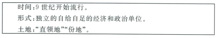 21.C 根据学习内容和题干材料中的“直领地”“份地”及自给自足的经济和政治单位等信息,可知这是西欧的封建庄园。本题选C。