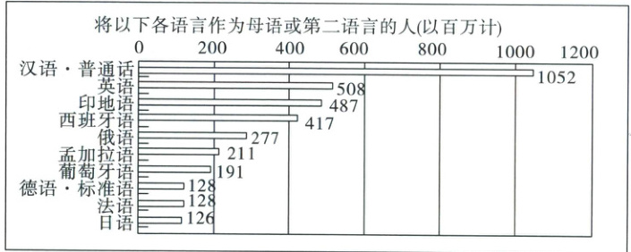 20.C 工业革命开始于18世纪60年代的英国,15到18世纪不符合这个时间点。本国人口基数多,人口增长迅速都不符合英国和西班牙的实际。这个历史时期,西班牙、葡萄牙、英国等国先后开展了殖民掠夺和殖民扩张,在世界各地建立了许多殖民地,其语言在殖民地得到使用,所以使用人数比较多。本题选C。