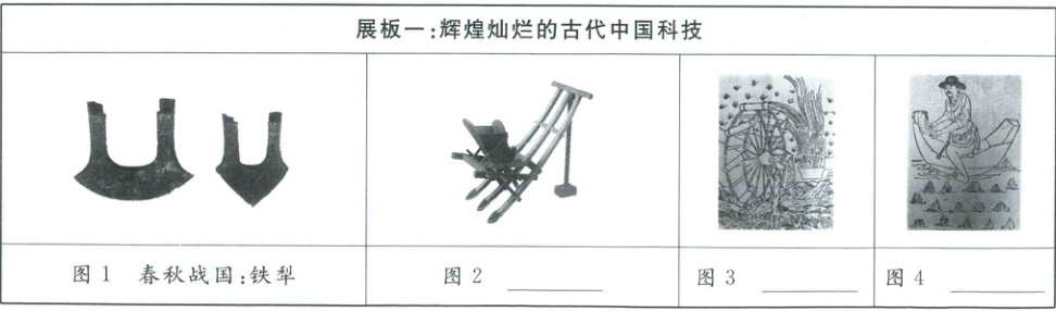 (1)图2汉:耧车图3唐:筒车图4宋:秧马(任选两个,4分)