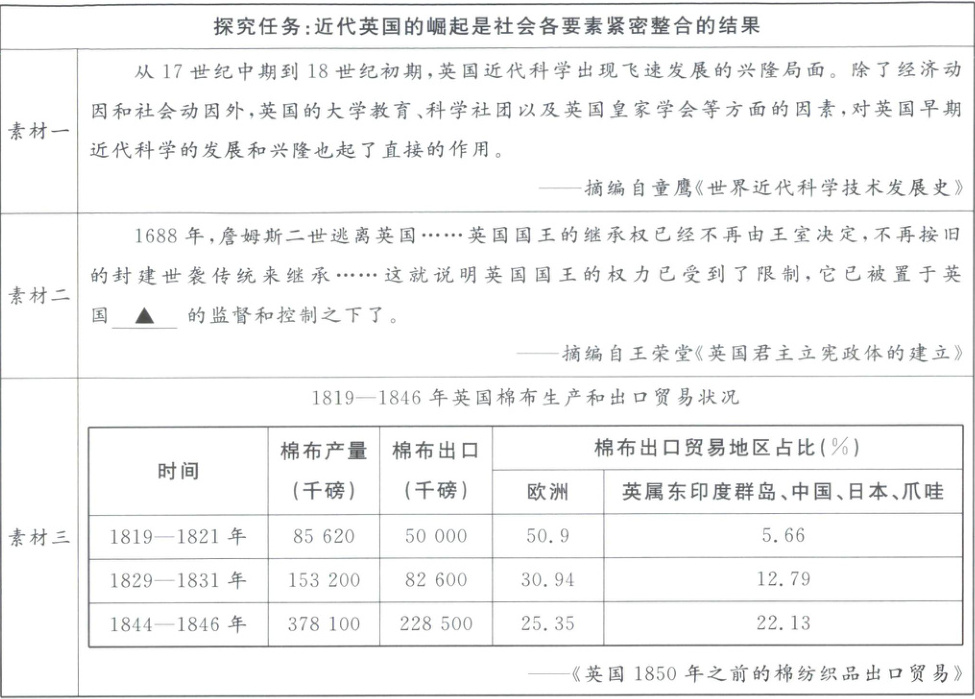 (4)运用三则素材,结合所学知识,概述"近代英国的崛起是社会各要素紧密整合的结果"这一观点。(6分)