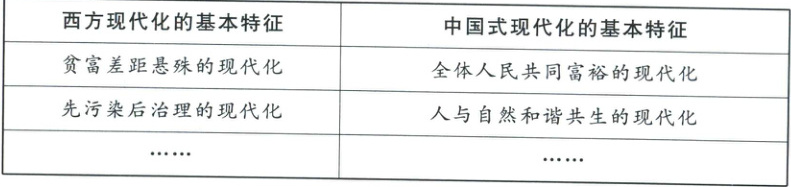 (3)全体人民共同富裕的现代化:共同富裕是中国特色社会主义的本质要求。(2分)或人与自然和谐共生的现代化:追求人与自然和谐共生,是人类面对生态危机作出的智慧选择;自然是生命之母,人与自然是生命共同体;生态兴则文明兴,生态衰则文明衰。(任写1点,2分)