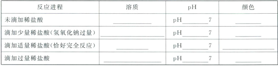 1.氢氧化钠;大于;红色;氢氧化钠和氯化钠;大于;红色;氯化钠;等于;红色变为无色;氯化钠和氯化氢;小于;无色