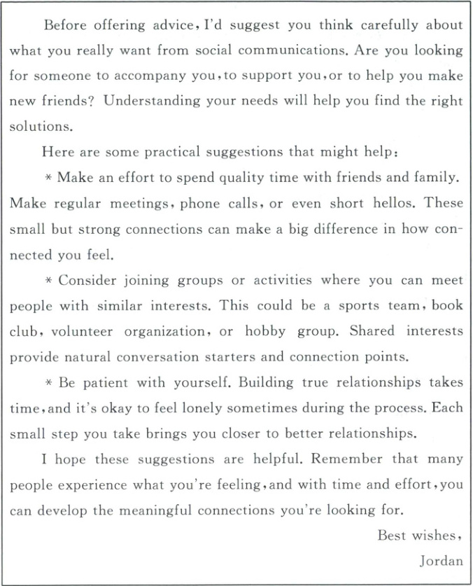 )16. What does the letter say about feeling lonely in crowds?A. It can never be changed.