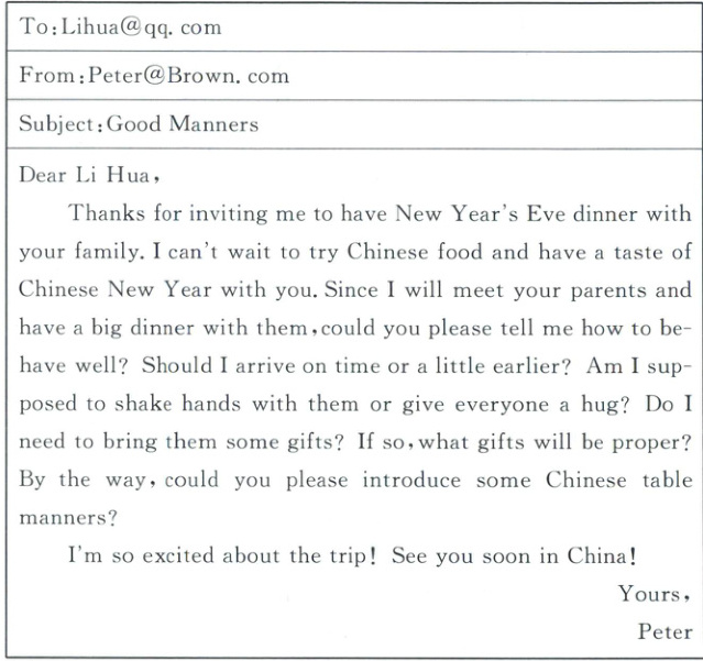 中国共度春节。出行前,Peter 给你写了一封邮件,希望得到