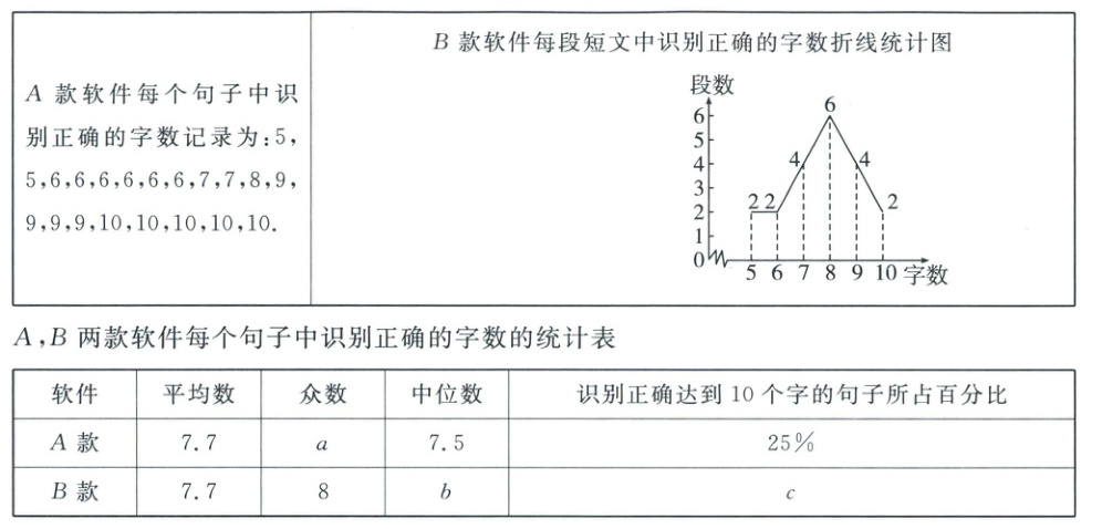 (1)A款软件每个句子中识别正确的字数出现次数最多的是6个,共出现6次,因此A款软件每个句子中识别正确的字数的众数为6个,即a = 6,