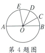 4. 如图,AB是⊙O的直径,$\overset{\frown}{BC}=\overset{\frown}{CD}=\overset{\frown}{DE}$,若∠COD=35°,则∠AOE的度数是(