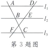 3. 已知$l_1 // l_2 // l_3$,$\frac{AB}{BC}=\frac{3}{5}$,$DE = 9$,则$EF =$(