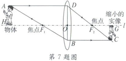7. 凸透镜成像的原理如图所示,$AD // l // BC$。若物体到焦点$F_1$的距离与焦点$F_1$到凸透镜的中心线$DB$的距离之比为$5:4$,则物体被缩小到原来的(