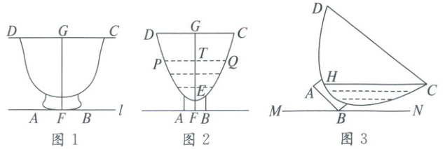 16. 图1是一个瓷碗,图2是其截面图,碗体$DEC$呈抛物线状(碗体厚度不计),碗口宽$CD=12cm$,此时面汤最大深度$EG=8cm$。