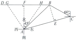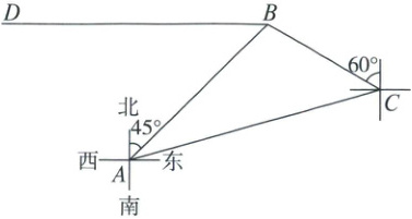 (1) 求点$B$到路线$CA$的最短距离;(精确到$0.1km$,参考数据:$\sqrt{2} \approx 1.414$,$\sqrt{3} \approx 1.732$)