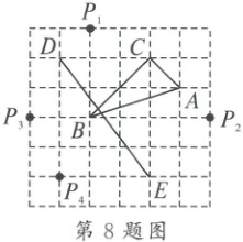8. 如图,在 $ 6 × 6 $ 方格中,点 $ A $,$ B $,$ C $,$ D $,$ E $ 均在格点上,若 $ \triangle ABC $ 与 $ \triangle DEP_i (i = 1, 2, 3, 4) $ 相似,则符合条件的格点 $ P_i $ 是( )
