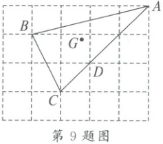 9. 如图,在$5×4$的正方形网格中,点$A$,$B$,$C$,$D$都是网格的格点,$G$是$\triangle ABC$的重心,则下列说法正确的是(