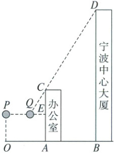20. (8分)宁波中心大厦是浙江在建第一高楼,某兴趣小组用无人机航拍测量宁波中心大厦的高度。无人机的起飞点为地面上的点$O$处,点$O$与办公楼的水平距离$OA$为100m,与宁波中心大厦的水平距离$OB$为260m。无人机先从点$O$处垂直起飞,到高度为89米的$P$处时,沿与地面平行方向水平飞行到点$Q$,此时测得办公楼顶部$C$的仰角$\angle CQE$为$58^{\circ}$,宁波中心大厦顶部$D$的仰角$\angle DQE$也为$58^{\circ}$。已知办公楼$AC$的高度是153m。
