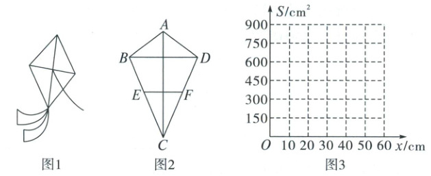(1)设筝面$ABCD$的面积为$S(cm^{2})$,骨架$BD$的长度为$x(cm)$,求$S$关于$x$的函数关系式;