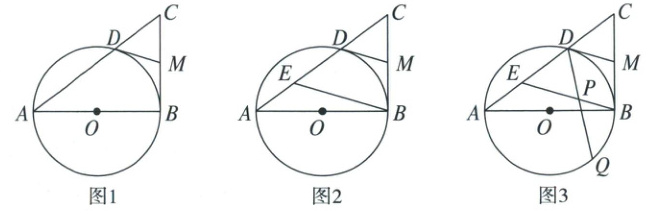 24. (12分)如图1,$Rt\triangle ABC$中,$\angle ABC = 90^{\circ}$,$AB = 20$,$BC = 15$,以$AB$为直径的$\odot O$交$AC$于点$D$,$M$是$BC$的中点,连结$DM$。