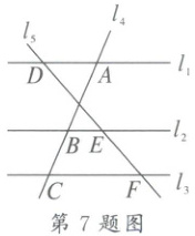 7. 如图,已知直线 $l_1$,$l_2$,$l_3$ 分别交直线 $l_4$ 于点 $A$,$B$,$C$,交直线 $l_5$ 于点 $D$,$E$,$F$,且 $l_1 // l_2 // l_3$。若 $AB = 4$,$AC = 6$,$DF = 9$,则 $EF =$(