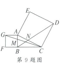 9. 如图,在 $Rt\triangle ABC$ 中,$\angle ABC = 90^{\circ}$,以 $AB$,$AC$ 为边分别向外作正方形 $ABFG$ 和正方形 $ACDE$,$CG$ 交 $AB$ 于点 $M$,$BD$ 交 $AC$ 于点 $N$。若 $\frac{GM}{CM} = \frac{1}{2}$,则 $\frac{AN}{CN} =$(