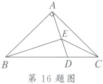 16.$\frac{\sqrt{10}}{5}$ 解析:如图,过点E作$PQ// BC$交AB于点P,交AC于点Q,则$\triangle APE\sim \triangle ABD$,$\triangle AQE\sim \triangle ACD$,$\therefore \frac{PE}{BD} = \frac{AE}{AD} = \frac{EQ}{DC}$。$\because BD = 2DC$,$\therefore \frac{PE}{2DC} = \frac{EQ}{DC}$,$\therefore \frac{PE}{EQ} = \frac{2DC}{DC} = 2$,$\therefore PE = 2EQ = PQ - EQ$,$\therefore EQ = \frac{1}{3}PQ$。$\because \triangle ABC$是等腰直角三角形,$\angle BAC = 90°$,$\therefore AB = AC$,$\angle ABC = \angle ACB = 45°$,$\therefore \angle BPE = \angle EQC = 135°$,$\angle APQ = \angle AQP$,$\therefore AP = AQ$,$\therefore BP = AB - AP = AC - AQ = QC$。$\because \angle BEC = 135°$,$\therefore \angle QEC + \angle PEB = 45°$,$\therefore \angle PBE + \angle PEB = \angle APQ = 45°$,$\therefore \angle PBE = \angle QEC$,$\therefore \triangle PBE\sim \triangle QEC$,$\therefore \frac{BP}{EQ} = \frac{PE}{QC}$,$\therefore QC^2 = 2EQ^2$,$\therefore QC = \sqrt{2}EQ = \sqrt{2}× \frac{1}{3}PQ = \frac{\sqrt{2}}{3}PQ$。$\because PQ = \sqrt{AP^2 + AQ^2} = \sqrt{2}AQ$,$EQ = \frac{\sqrt{2}}{2}QC$,$\therefore QC = \frac{\sqrt{2}}{3}× \sqrt{2}AQ = \frac{2}{3}AQ = \frac{2}{3}(AC - QC)$,$\therefore QC = \frac{2}{5}AC$,$\therefore EQ = \frac{\sqrt{2}}{2}× \frac{2}{5}AC = \frac{\sqrt{2}}{5}AC$。$\because \angle CQE = \angle BEC = 135°$,$\angle CEQ = \angle BCE$,$\therefore \triangle CEQ\sim \triangle BCE$,$\therefore \frac{EQ}{CE} = \frac{CE}{BC}$,$\therefore CE^2 = EQ· BC = \frac{\sqrt{2}}{5}AC× \sqrt{2}AC = \frac{2}{5}AC^2$,$\therefore \frac{CE^2}{AC^2} = \frac{2}{5}$,$\therefore \frac{CE}{AC} = \frac{\sqrt{10}}{5}$。故答案为$\frac{\sqrt{10}}{5}$。