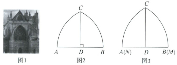 22. (10 分) 在古今中外许多著名建筑中,有很多应用圆弧设计的元素。如图 1,哥特式尖拱是由两段不同圆心的圆弧组成的对称图形,叫做两心尖拱。图 2 是两心尖拱的示意图,其中,点 $A$,$B$ 称为起拱处,点 $C$ 称为拱尖,$C$ 到 $AB$ 的距离 $CD$ 称为拱高,$\overset{\frown}{AC}$ 与 $\overset{\frown}{BC}$ 关于直线 $CD$ 成轴对称,$\overset{\frown}{AC}$ 和 $\overset{\frown}{BC}$ 的圆心分别是点 $M$,$N$,且 $M$,$N$ 恰好落在直线 $AB$ 上。