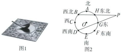 22. (10分)司南是我国古代辨别方向用的一种仪器,早在战国时期就已被发明,是现代所用指南针的始祖(如图1)。司南中心为一圆形,圆心为点$O$,直径为20cm,根据八个方位将圆形八等分(图2中的点$A \sim H$),连结$DG$,$BH$并延长交于点$P$。