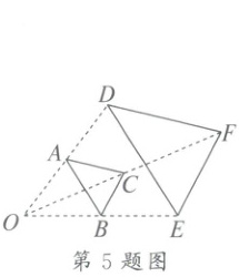 5. 如图,$ \triangle ABC $ 与 $ \triangle DEF $ 是位似图形,点 $ O $ 为位似中心,$ OA = AD $。若 $ \triangle ABC $ 的面积为4,则 $ \triangle DEF $ 的面积为(