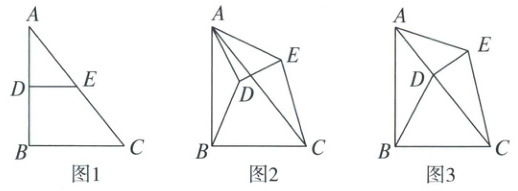 22. (6分)如图1,在 $ \triangle ABC $ 中,$ \angle A B C = 90 ^ { \circ } $,$ A B = 8 $,$ B C = 6 $,分别取 $ AB $,$ AC $ 的中点 $ D $,$ E $,连结 $ DE $。如图2,将图1中的 $ \triangle ADE $ 绕点 $ A $ 逆时针旋转,连结 $ BD $,$ CE $。