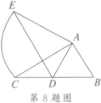8. 如图,将$Rt\triangle ABC$以点$A$为中心顺时针旋转得到$\triangle ADE$,若点$B$的对应点$D$恰为$BC$边的中点,$AB = 1$,则$\overset{\frown}{CE}$的长为(