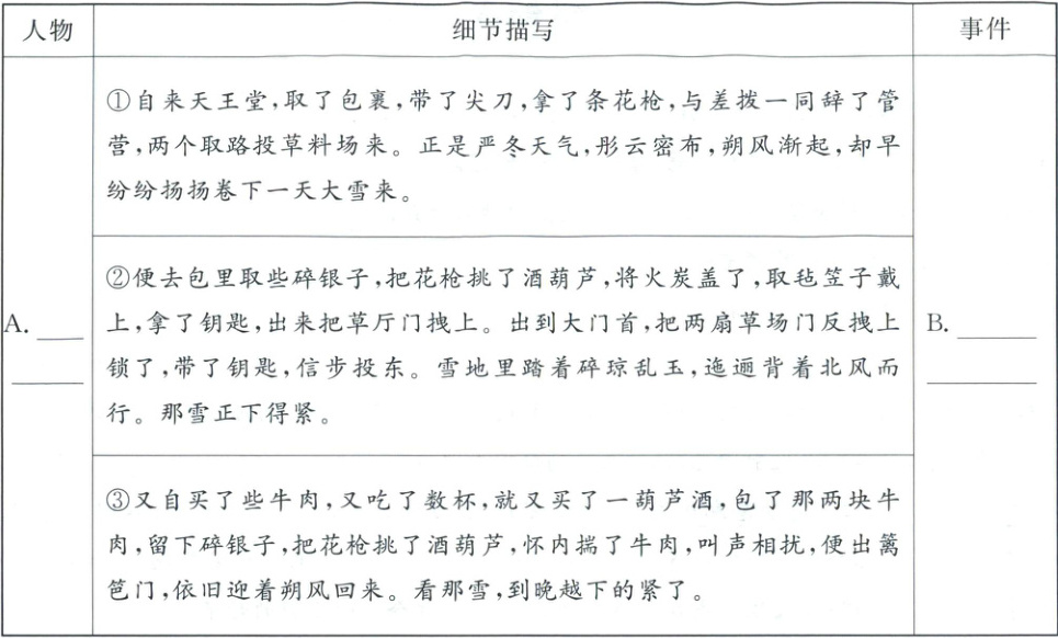 (写名字),B 为火烧草料场(或风雪山神庙)