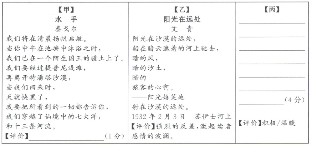 3. 诗歌点评与创作。点评甲诗,仿照甲乙两首诗歌,自创一首小诗(不少于 4 行)。(5 分)