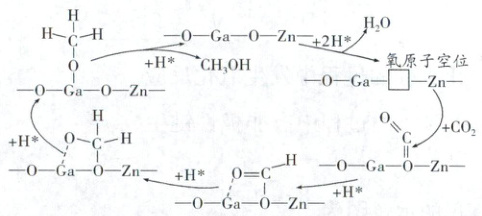 利用CO₂加氢制CH₃OH的反应机理如图所示。H₂首先在ZnGaO₃催化剂表面解离成2个H*,随后参与到CO₂的还原过程。下列说法错误的是(