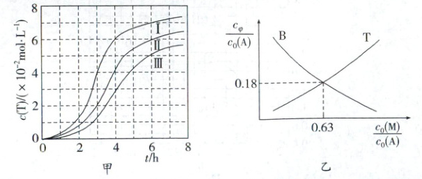 (3)研究团队继续研究其他条件不变时,不同醇烯比 $\frac{c_{0}(M)}{c_{0}(A)}$ (甲醇 M 与烯烃 A 的起始物质的量浓度之比) 对平衡的影响,当 A 的起始浓度 $c_{0}(A)=0.10mol· L^{-1}$ 时,测得平衡时 $\frac{c_{\varphi}}{c_{0}(A)}$ 随 $\frac{c_{0}(M)}{c_{0}(A)}$ 的变化曲线如图乙 $[c_{\varphi}$ 表示 $c(B)$ 或 $c(T)]$。曲线 T 呈现如图乙所示变化的原因是