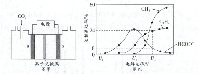 (填化学式)。②当电解电压为U₃V时,电解生成的C₂H₄和HCOO⁻的物质的量之比为