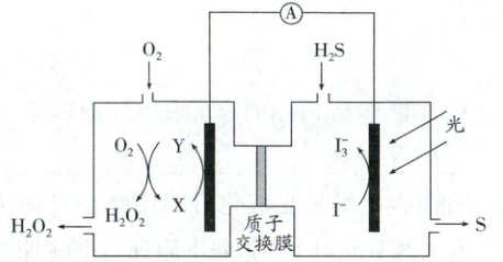 装置右侧电极在光照条件下$I^-$失去电子生成$I_3^-$,发生氧化反应,为负极,左侧为正极,电极上X生成Y,发生还原反应。