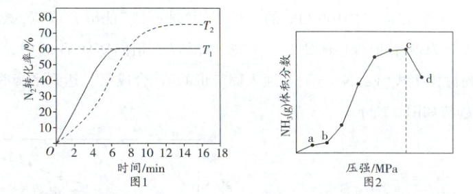(结果保留三位有效数字)。(5)一定温度下,向体积可变的密闭容器中充入 1 mol N₂和 4 mol H₂合成 NH₃,测得 NH₃体积分数与压强关系如图 2 所示。