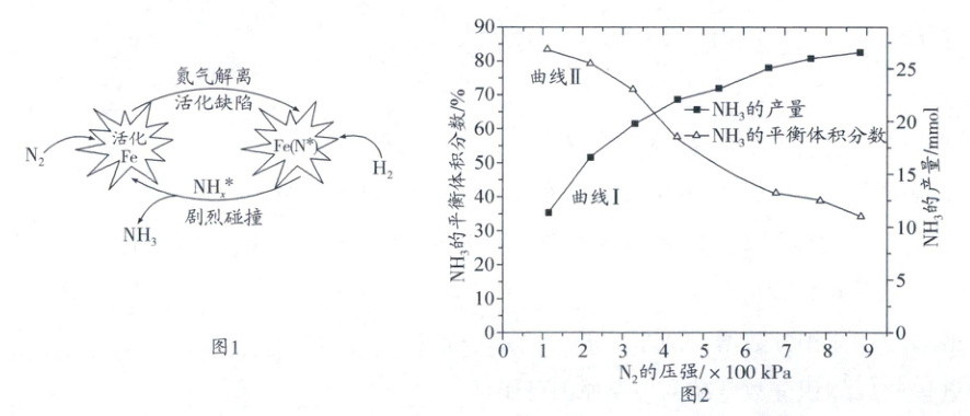 (填“焓变”或“熵变”)。②进一步研究发现,在 45℃、100 kPa 的条件下用“球磨法”能够合成氨,氨的体积分数可高达 82.5%。该法分为两个步骤(如图 1)。在多个恒容的相同密闭容器中,分别先通入不同量的 N₂,与铁粉碰撞生成[Fe(N*)],再通入固定量的 H₂合成氨。达到平衡时,NH₃的含量随 N₂的压强变化趋势如图 2 所示。