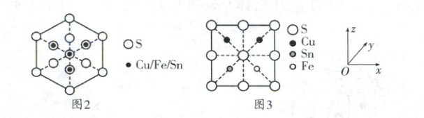 (4)一种含铜的多元金属硫化物的晶胞结构为四方晶系,已知金属原子均呈四面体配位,晶胞棱边夹角均为90°,其结构可看作是由两个立方体A、B上下堆叠而成。图2为A沿体对角线的投影图,图3为B沿$y$轴方向的投影图。A中Fe、Sn位置互换即为B。立方体A、B棱长均为$a$ pm,晶胞中部分原子的分数坐标为S(0,0,0)、Fe$\begin{pmatrix} \frac {3}{4},\frac {1}{4},\frac {1}{8}\end{pmatrix}$。