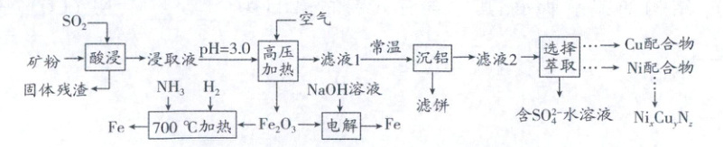 解题思路矿粉通入$\mathrm{SO}_{2}$酸浸,浸取液中含有$\mathrm{Fe}^{2+}$、$\mathrm{Cu}^{2+}$、$\mathrm{Ni}^{2+}$、$\mathrm{Al}^{3+}$等,调节$\mathrm{pH}=3.0$,通入空气加热得到$\mathrm{Fe}_{2}\mathrm{O}_{3}$,$\mathrm{Fe}_{2}\mathrm{O}_{3}$可以通过还原得到$\mathrm{Fe}$单质,也可以用电解法得到$\mathrm{Fe}$单质,滤液1在常温下沉铝,滤液2选择萃取得到含硫酸根离子的溶液及$\mathrm{Cu}$配合物和$\mathrm{Ni}$配合物,最终得到产品$\mathrm{Ni}_{x}\mathrm{Cu}_{y}\mathrm{N}_{z}$。