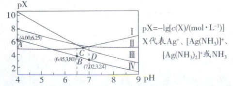 本题中pH越小,酸性越强,$\mathrm{Ag^+}$浓度越大,氨气浓度越小,所以Ⅲ代表$\mathrm{[Ag(NH_3)_2]^+}$,Ⅱ代表$\mathrm{[Ag(NH_3)]^+}$,Ⅳ代表$\mathrm{NH_3}$,Ⅰ代表$\mathrm{Ag^+}$。