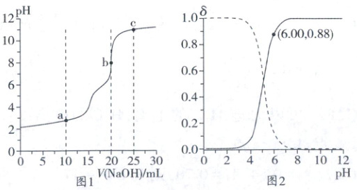 甲醛法测定 NH₄⁺的反应原理为 4NH₄⁺ + 6HCHO = (CH₂)₆N₄H⁺ + 3H⁺ + 6H₂O。取含 NH₄Cl 的废水浓缩至原体积的 1/10 后,移取 20.00 mL,加入足量甲醛反应后,用 0.010 00 mol·L⁻¹ 的 NaOH 标准溶液滴定。滴定曲线如图 1,含氮微粒的分布分数 δ 与 pH 关系如图 2{比如:δ[(CH₂)₆N₄H⁺] = c[(CH₂)₆N₄H⁺]/(c[(CH₂)₆N₄H⁺] + c[(CH₂)₆N₄])}。下列说法正确的是(