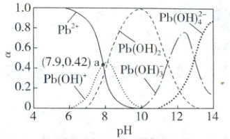 工业上用氨气调节 pH 去除酸性废水中的铅。常温时,原溶液中含铅微粒的总物质的量浓度为 0.01 mol·L⁻¹,各含铅微粒的物质的量分数 α 与 pH 的关系如图所示[已知:NH₃·H₂O 的 Kb = 1.74×10⁻⁵,Pb(OH)₂难溶于水,10⁻⁰.² ≈ 0.63,忽略溶液体积的变化]。下列说法正确的是(