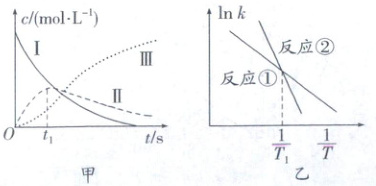 恒温恒容条件下,向密闭容器中加入一定量${X}$,发生反应①${X⇌ Y}$、②${Y⇌ Z}$。反应①的速率$v_{1} = k_{1}c({X})$,反应②的速率$v_{2} = k_{2}c({Y})$,式中$k_{1}$、$k_{2}$为速率常数。图甲为该体系中${X}$、${Y}$、${Z}$浓度随时间变化的曲线,图乙为反应①和②的$\ln k~\dfrac{1}{T}$关系曲线。