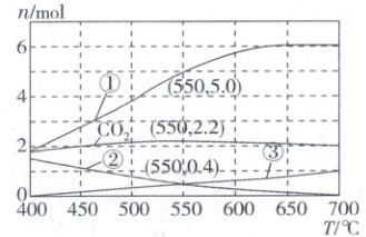 $1.0×10^{5}\ Pa$条件下,$1\ mol\ {C_{3}H_{8}O_{3}}$和$9\ mol\ {H_{2}O}$发生上述反应,达平衡状态时,体系中${CO}$、${H_{2}}$、${CO_{2}}$和${CH_{4}}$的物质的量随温度变化的理论计算结果如图。