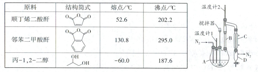 ①在装置 A 中加入上述三种原料,缓慢通入 N₂。搅拌下加热,两种酸酐分别与丙 - 1,2 - 二醇发生醇解反应,主要生成
